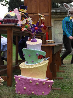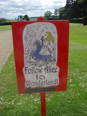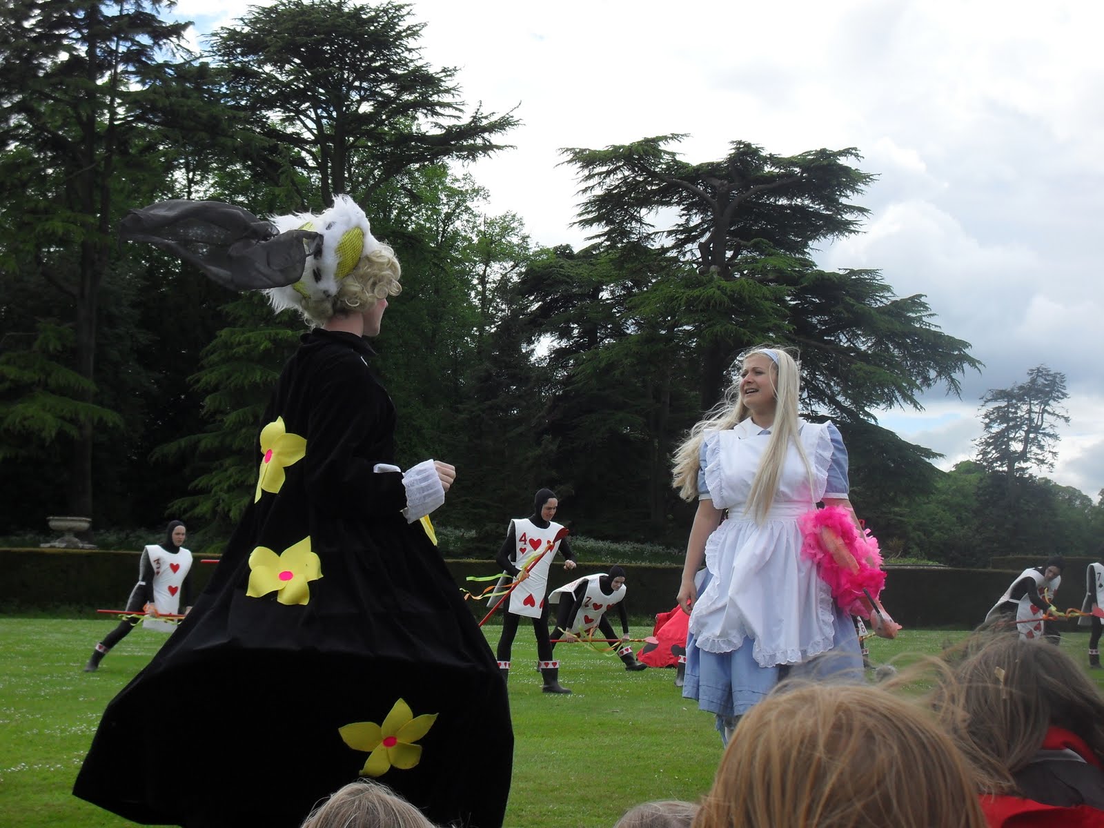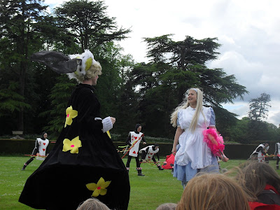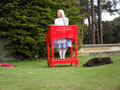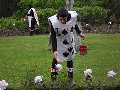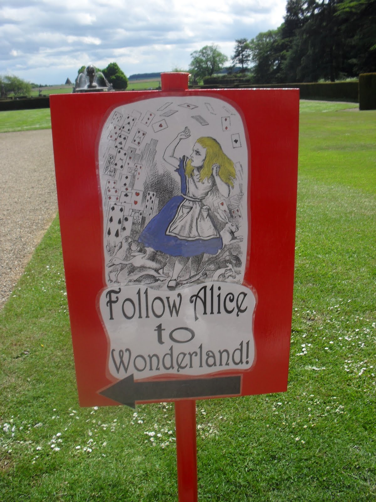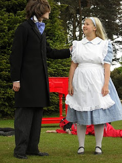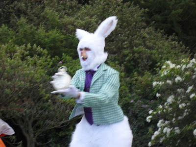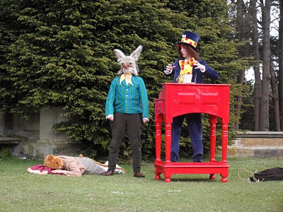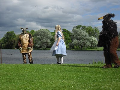 Alice, the White Rabbit and the Caterpillar. In the background you can see the fish that just gave the White Rabbit his invitation to the croquet.