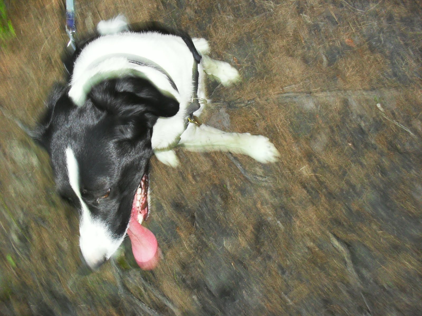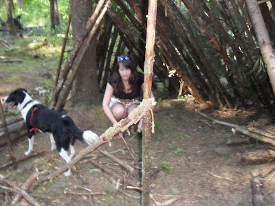 Pretending to make a fire in a den I found in the woods, and my dog Lottie.