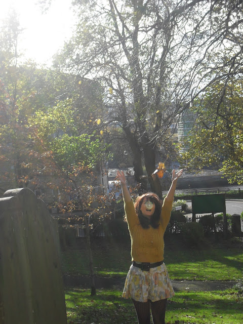 These photos are beautiful, they remind me of my post, haha vain much? I also threw leaves around much to my boyfriends amusement, but the pictures didn’t look so great! I want a grave yard next to my flat, i love the peaceful mood they always seem to have, i’d be out there reading everyday! (& your flat is lush btw!)