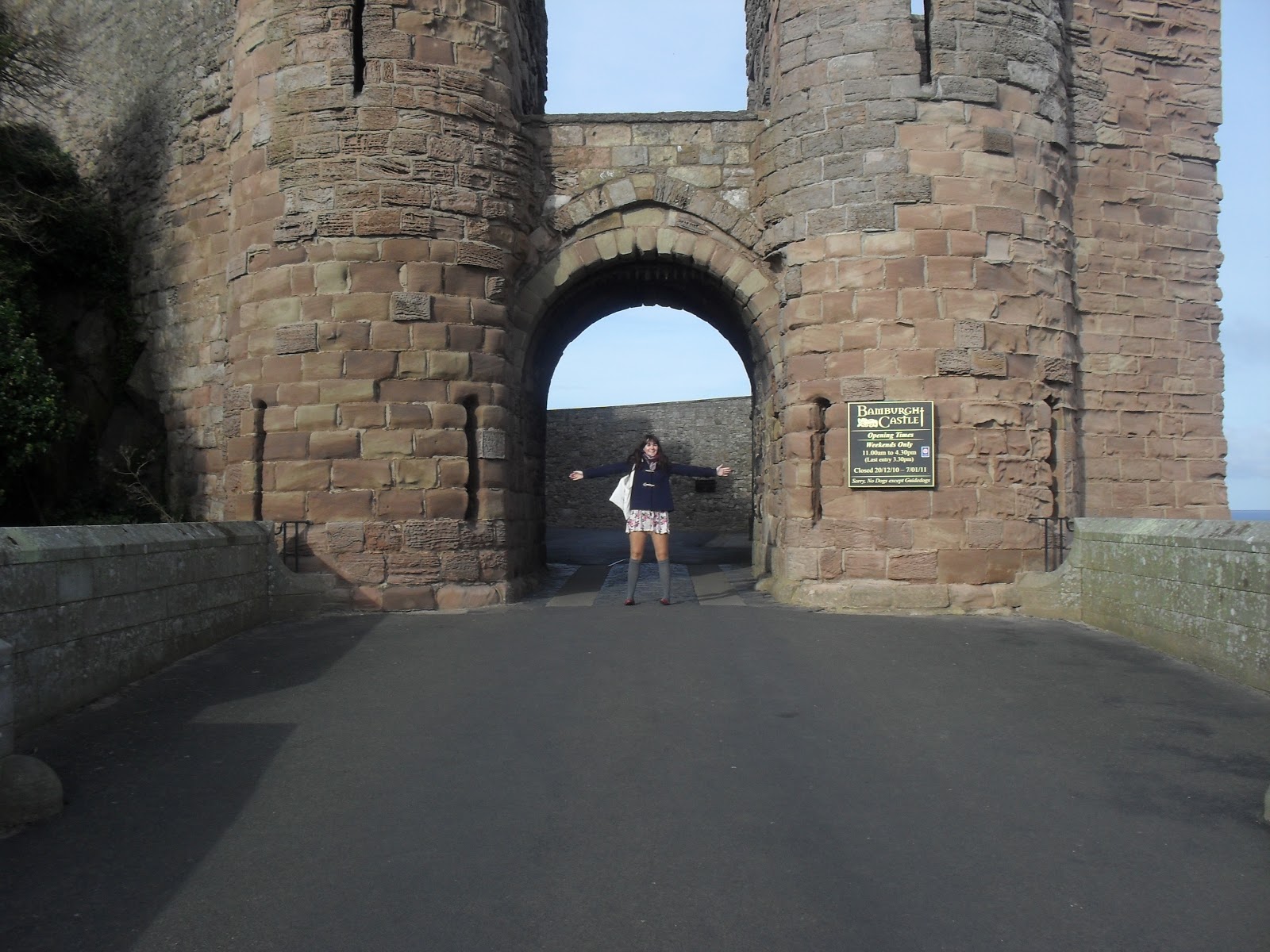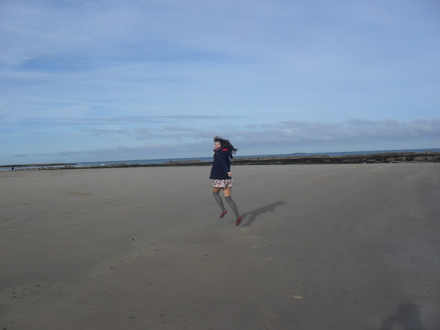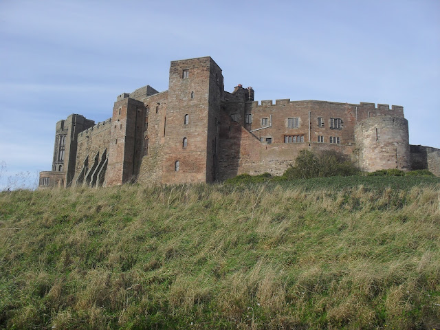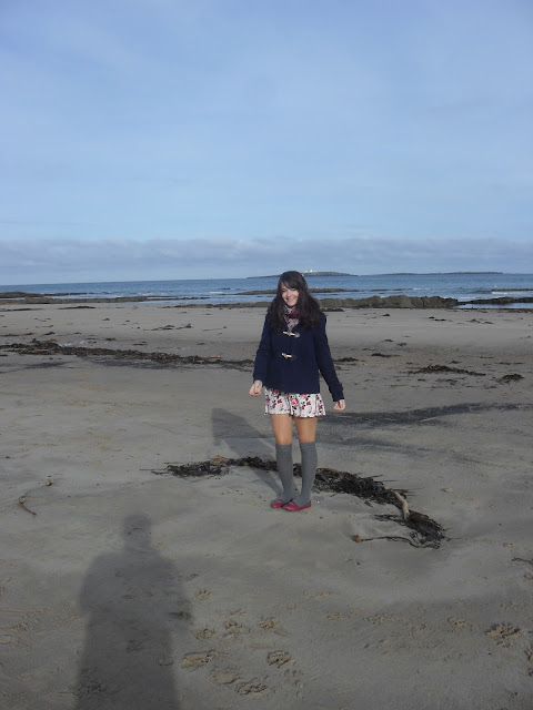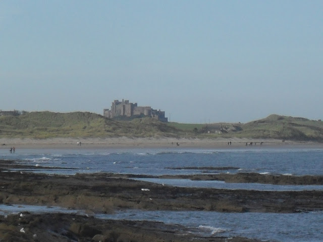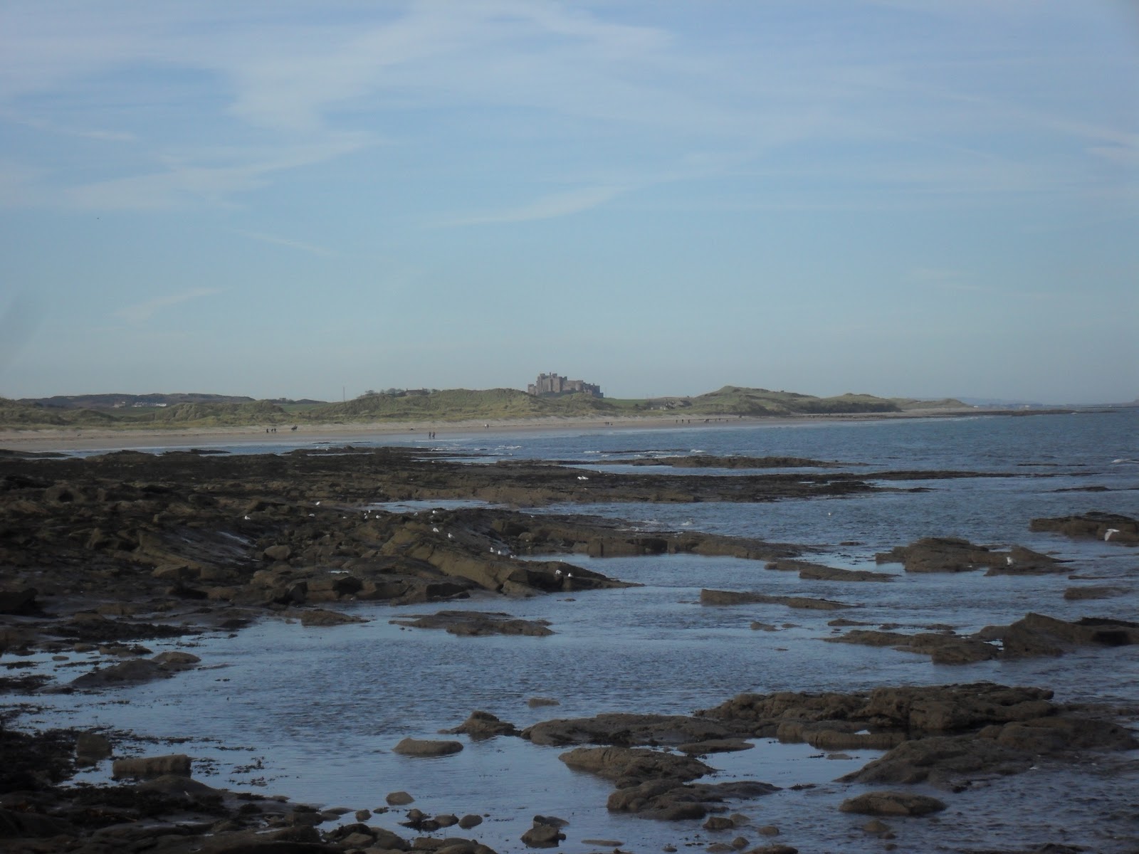 So first we went to have fish and chips in the town of Seahouses, then we had a little walk (in my case skip, see last picture!) on the beach. It was a little bracing and windy, but still nice! There were actually a lot of people walking along it, I was surprised! And a lot of seaweed. From the beach, and from Seahouses actually, you can see Bamburgh Castle, so I got a few pictures of that, however blurry they are! It is a very…oooh I can’t think of the word…imposing maybe? That’ll do! It is a very imposing looking castle, sat on a hill looking out over the bleak Northumbrian landscape and sea.