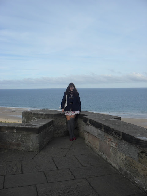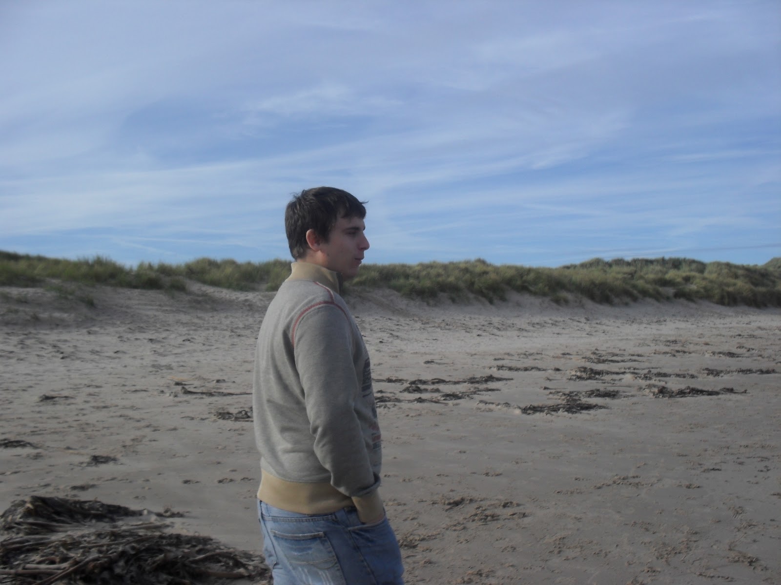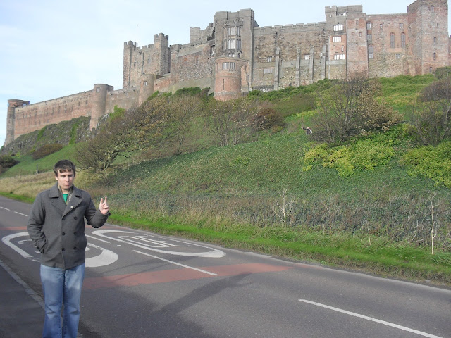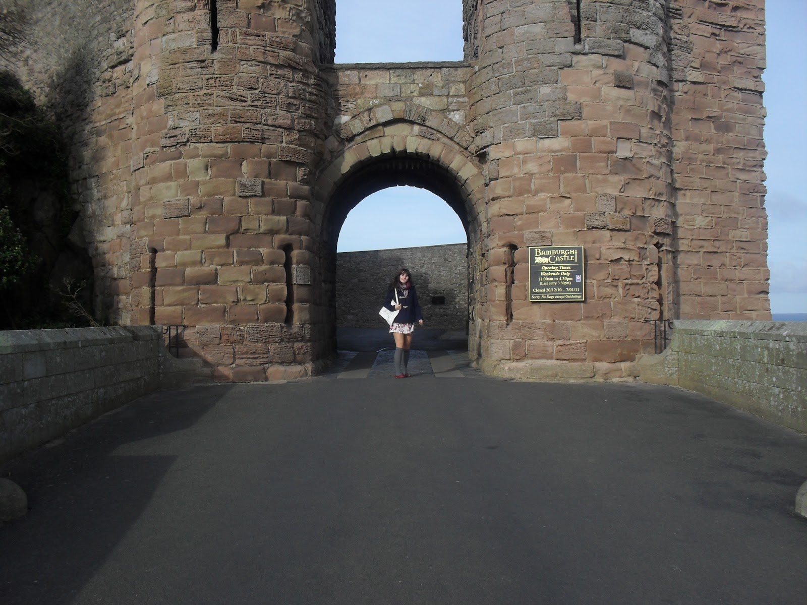 So first we went to have fish and chips in the town of Seahouses, then we had a little walk (in my case skip, see last picture!) on the beach. It was a little bracing and windy, but still nice! There were actually a lot of people walking along it, I was surprised! And a lot of seaweed. From the beach, and from Seahouses actually, you can see Bamburgh Castle, so I got a few pictures of that, however blurry they are! It is a very…oooh I can’t think of the word…imposing maybe? That’ll do! It is a very imposing looking castle, sat on a hill looking out over the bleak Northumbrian landscape and sea.