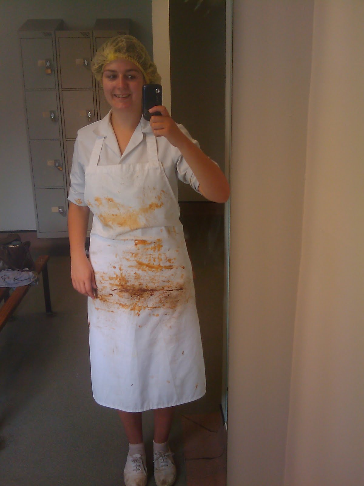 This is from when I was in there in summer, now my legs are covered and I have more sensible bakery shoes, ie. trainers rather than plimsolls because I tend to drop heavy things on my toes! Also my hat today was blue, not yellow, if you’re interested, we have to change hat colours every week, it alternates between yellow, blue and green. Blue is the most flattering though.