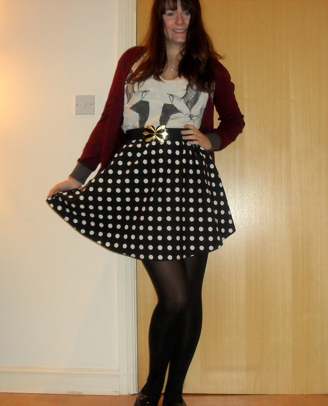 So the polka dot garment that I am wearing as a skirt is in fact a dress! I really love this dress by itself, it has a very 60s vibe about it, but I’ve generally only been able to wear it for going out and evening things because it seems a bit too dressy for anything else. It’s from this amazing shop in York called Blue Ballroom, but because it’s quite a way out of the centre, I don’t get to go there much so I don’t actually have many things from there, but I’m going to try and go there more often if I can. We don’t have many vintagey shops around us, so this one is quite a gem. There used to be another that was retro/vintage in York and I loved it, I have quite a collection of clothes from there but they closed to concentrate on their website =(