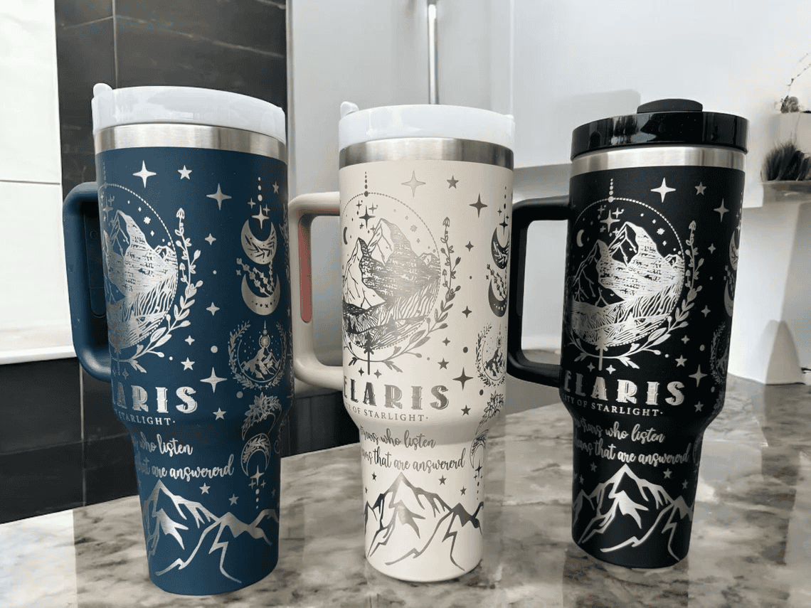 If you eat, sleep and dream of the Court of Night and Velaris, why not drink of it too? These tumblers are beautifully decorated with emblems of from ACOTAR, including the iconic “To the stars who listen, and the dreams that are answered” quote. These Velaris tumblers are probably good A Court of Frost and Starlight gifts too, because they give off those frosty vibes. Maybe they’d make good ACOTAR Christmas gifts!
