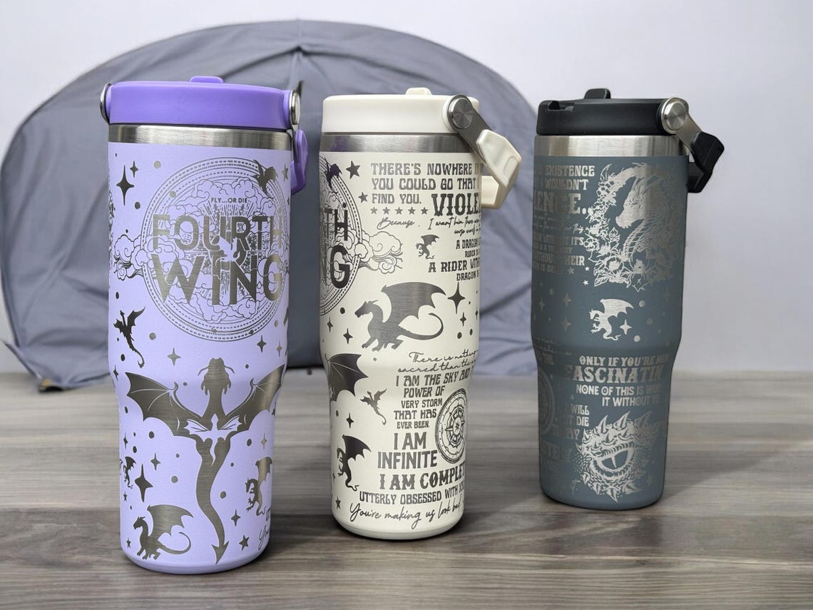 These are good sized 30oz water bottles, covered with the Fourth Wing logo, Tairn and Andarna, and other dragons, and are emblazoned with all the best Fourth Wing quotes including: